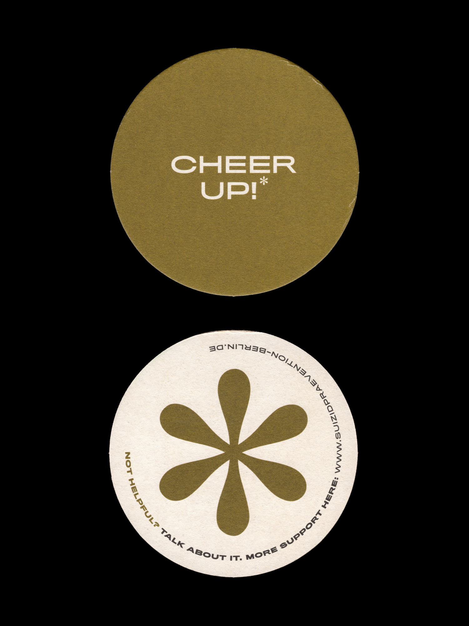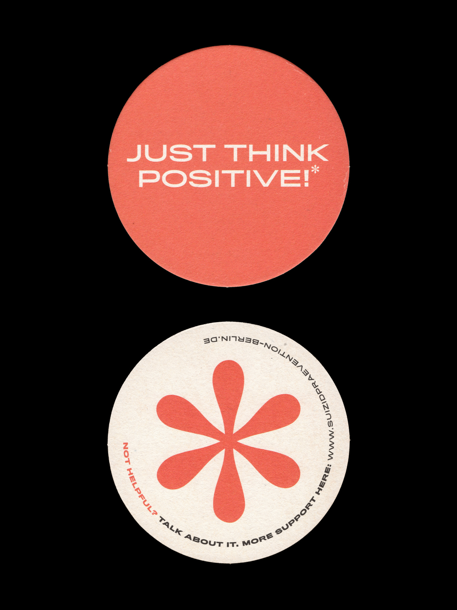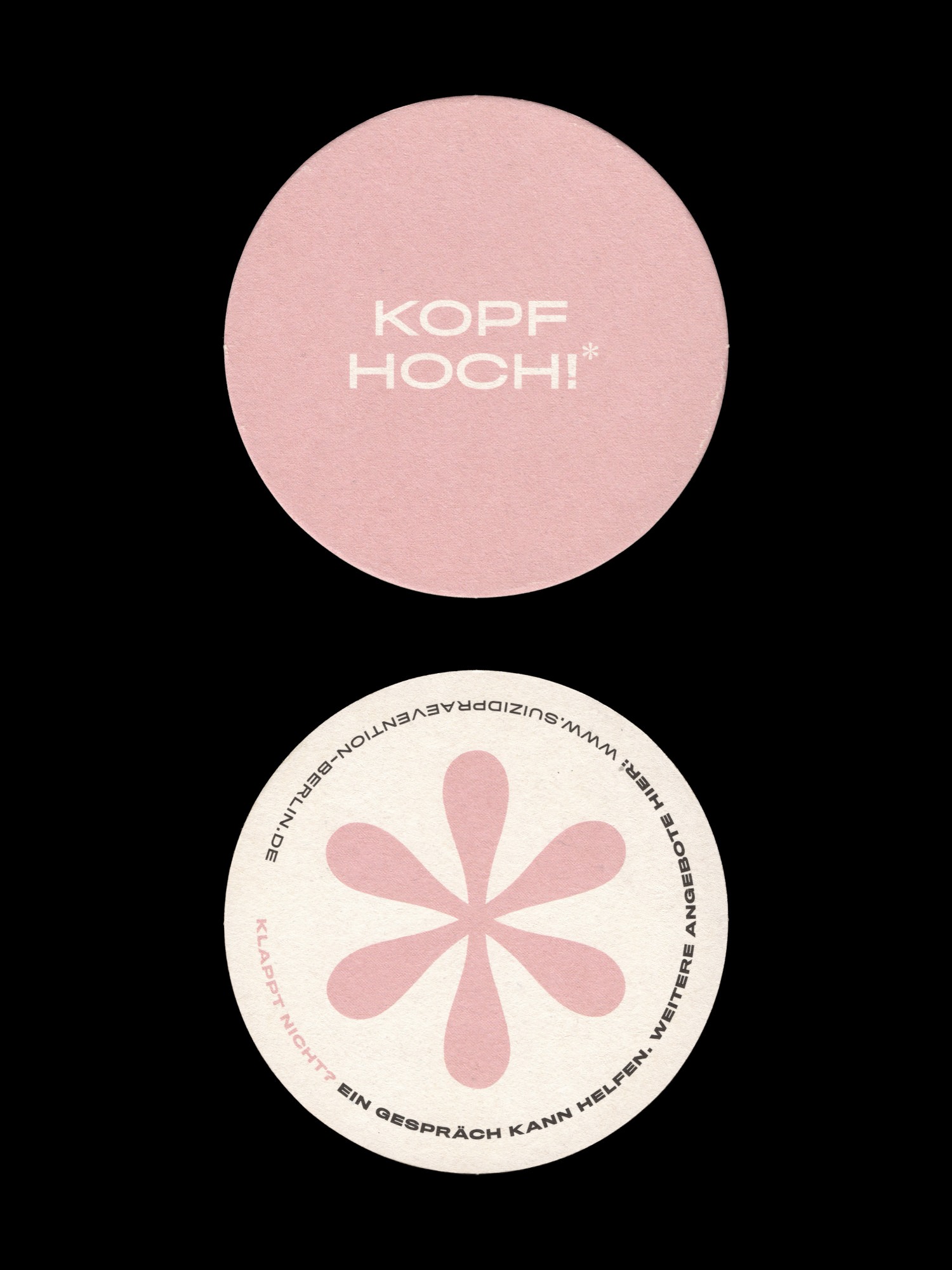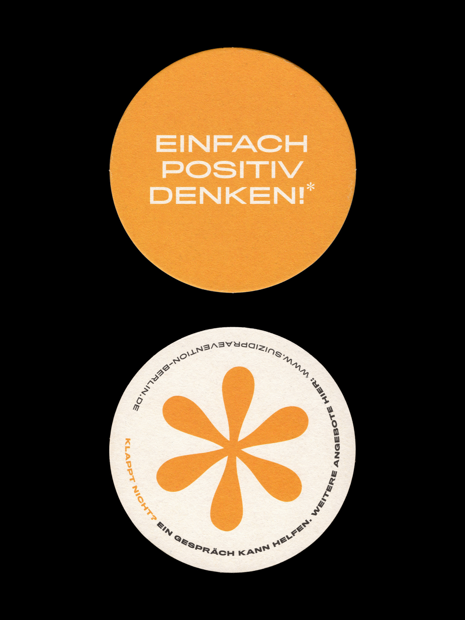 Am 10. September ist Welttag der Suizidprävention. Im Zuge dessen ist für den Caritasverband Berlin in Zusammenarbeit mit u25 Deutschland eine kleine Out of Home Kampagne entstanden. Die Wahl von Bierdeckeln als Medium ermöglicht eine ungezwungene Art das Thema in den öffentlichen Raum und an die Menschen heran zu tragen. Plakative und vor allem nicht hilfreiche Floskeln auf der einen Seite treffen auf ein ernstes und echtes Gesprächsangebot auf der Rückseite. Ziel ist es, das Thema Suizid zu enttabuisieren und Menschen zu ermutigen, offene Gespräche zu führen und Hilfe in Anspruch zu nehmen. (Telefonseelsorge, 24 Stunden erreichbar, 0800 1110111)