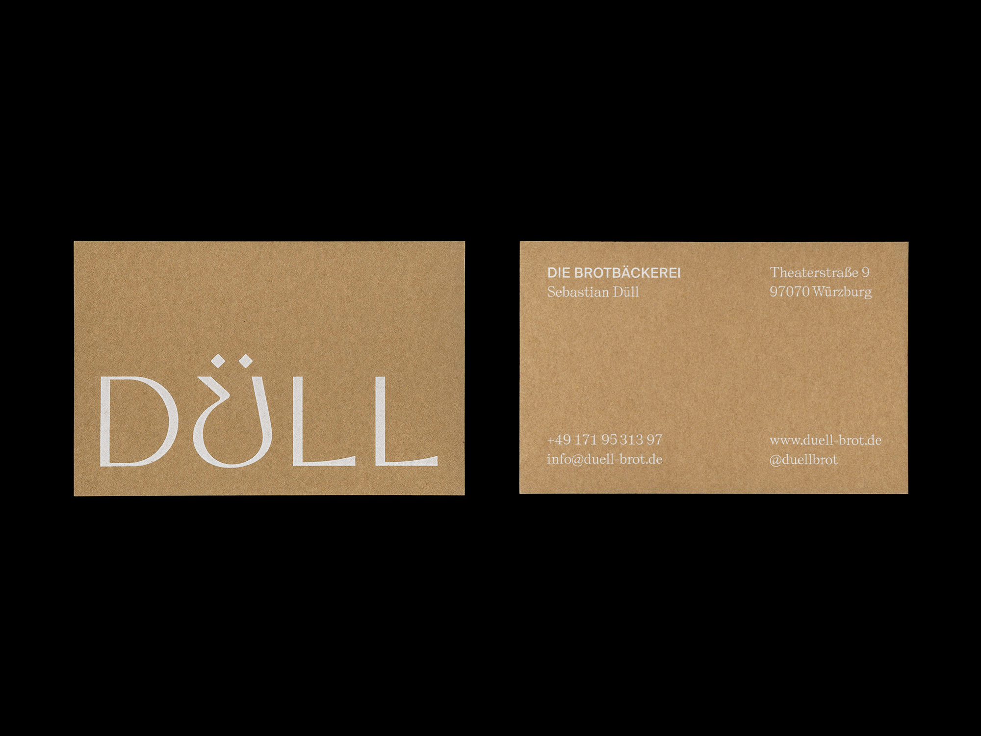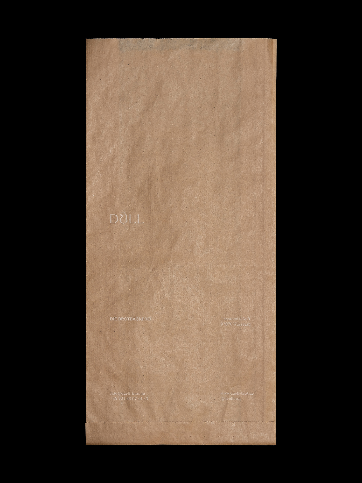 Düll ist eine Bäckerei in Würzburg mit einem besonderen Konzept: Es gibt sechs Brote. Die Darstellung dieser Brote nimmt die zentrale Rolle des Brandings ein. Durch sechs Fotografien wird die Geschichte des jeweiligen Produktes erzählt und der Geschmack sowie der Charakter jedes einzelnen Brotes visualisiert. Ergänzt wird das Erscheinungsbild durch eine prägnante Wortmarke, welche stringent auf allen weiteren gestalteten Medien, wie Schaufenster, Packaging, Visitenkarten und Tragetasche plakativ zum Einsatz kommt.