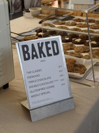 BAKED steht für „less but better“. Diese Haltung spiegelt sich im Design wider. Auf dem Isemarkt in Hamburg-Eppendorf verkauft BAKED handgemachte Cookies, bei deren Produktion der Fokus auf wenigen, aber dafür hochwertigen Zutaten liegt. Unser Ziel war es, einen selbstbewussten Look zu entwickeln, der eine unangestrengte Eleganz vermittelt. Kraftpapier trifft auf Edelstahlelemente – natürliche Wärme auf hochwertige Präzision.