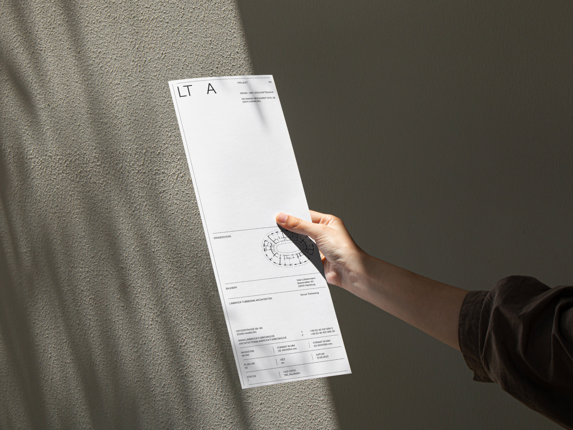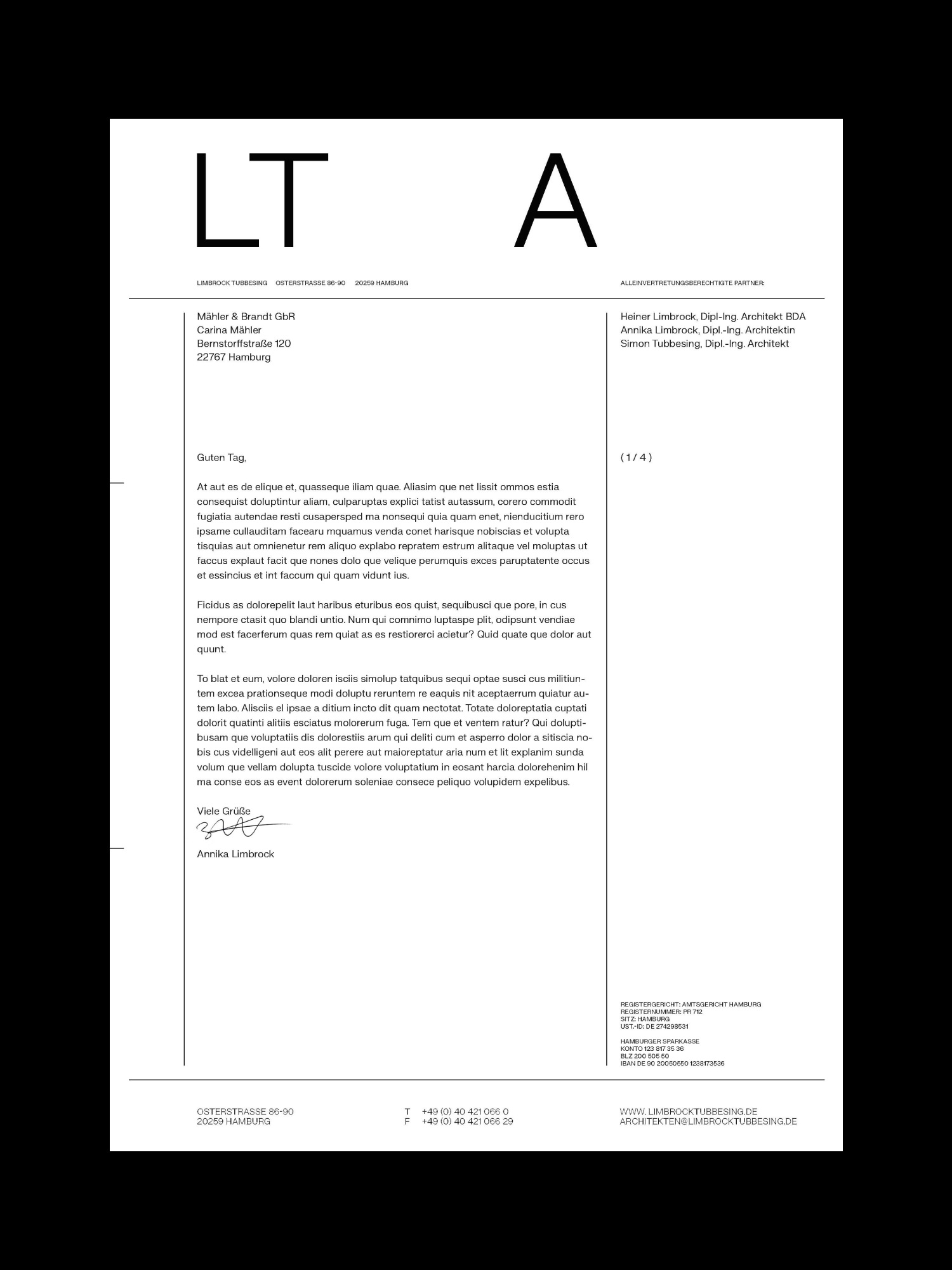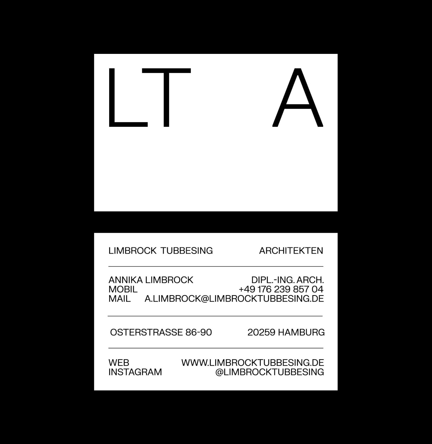 A minimalistic and typography-based corporate design has been created for Limbrock Tubbesing Architekten from Hamburg. The use of large-scale white space leaves room for the impression of the diverse projects. The use of the line as the primary design element emphasizes the guiding philosophy of LTA of consistency in concept, organization and project planning. In addition to a website, the stationery and various print media were designed.